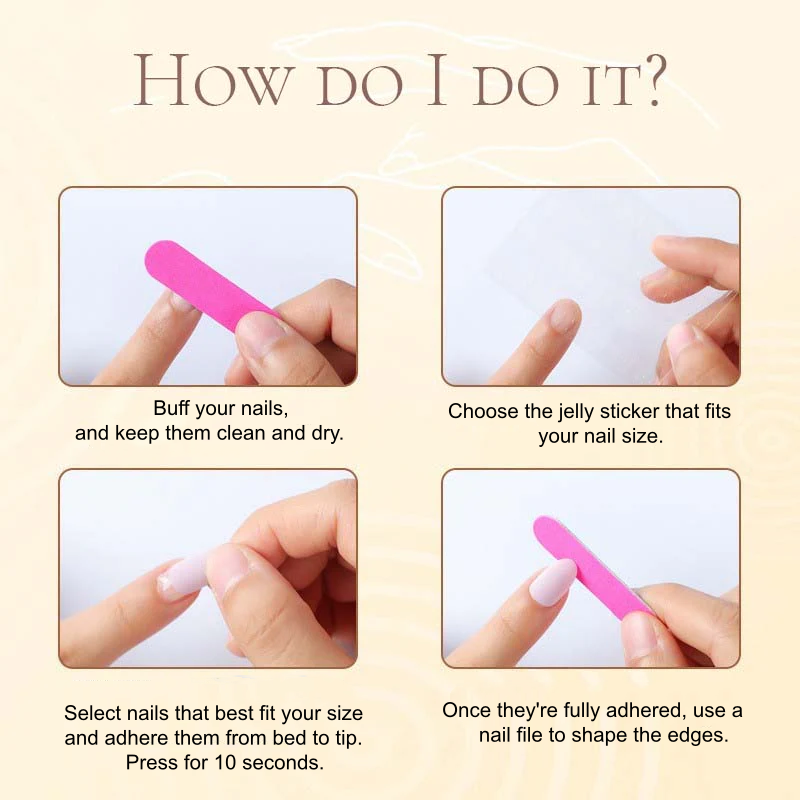 KÖNNYŰ FELVITEL:A mellékelt zselés ragasztós matricákkal perceken belül tökéletes manikűrt varázsolhat. Ez a rendetlenségmentes módszer kíméletes a természetes körmökhöz, és professzionális segítség nélkül is gyors, egyszerű felvitelt tesz lehetővé.
