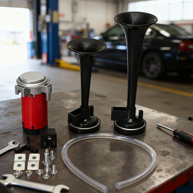 A készlet tartalma: kettős trombita légkürt + légkompresszor + relé + csővezeték + rögzítőelemek (több darab)