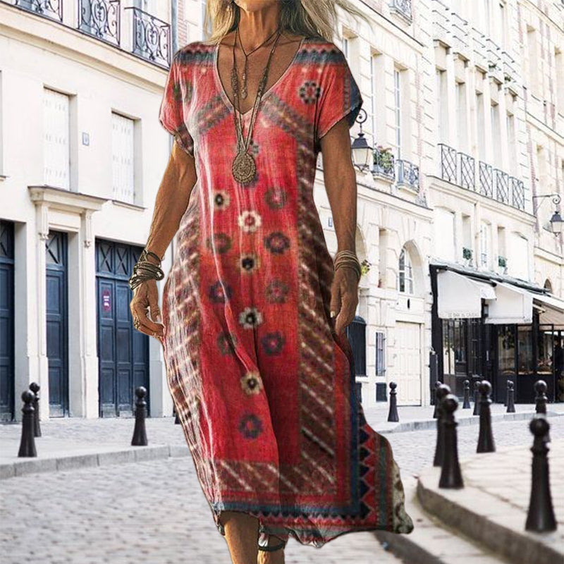 A csomag tartalma: 1 * Női nyomtatott V-nyakú rövid ujjú hosszú ruha